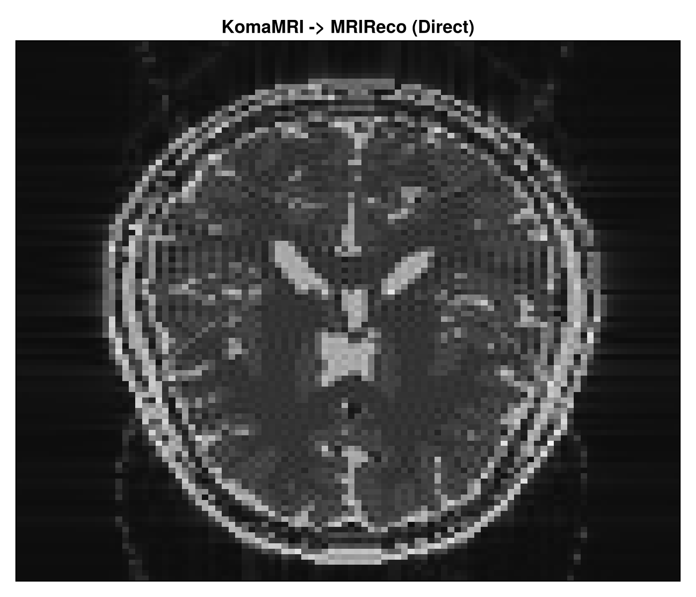 This step shows the Julia-native reconstruction path. The saved raw acquisition from KomaMRI is deserialized, converted into MRIReco’s input type, and reconstructed with a direct solver.