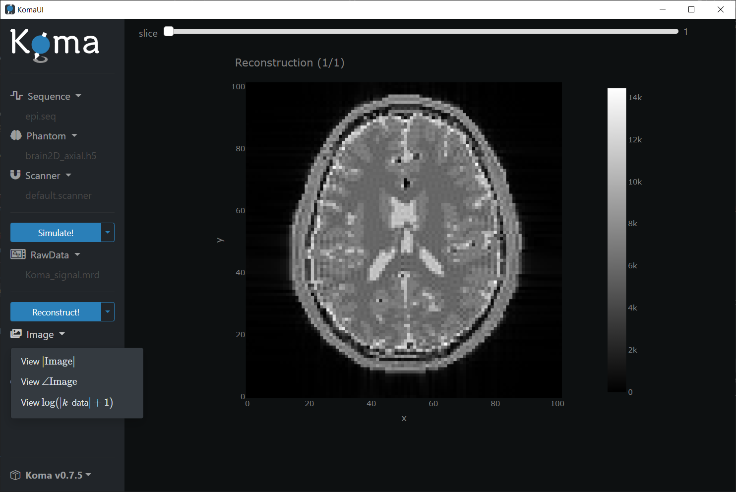 Press the Reconstruct! button to perform the reconstruction (this may take a while). Automatically the generated Image should be displayed or you can click on the he Reconstruct! dropdown and then press the |Image| button: