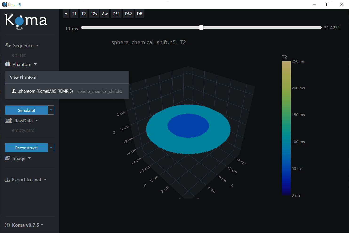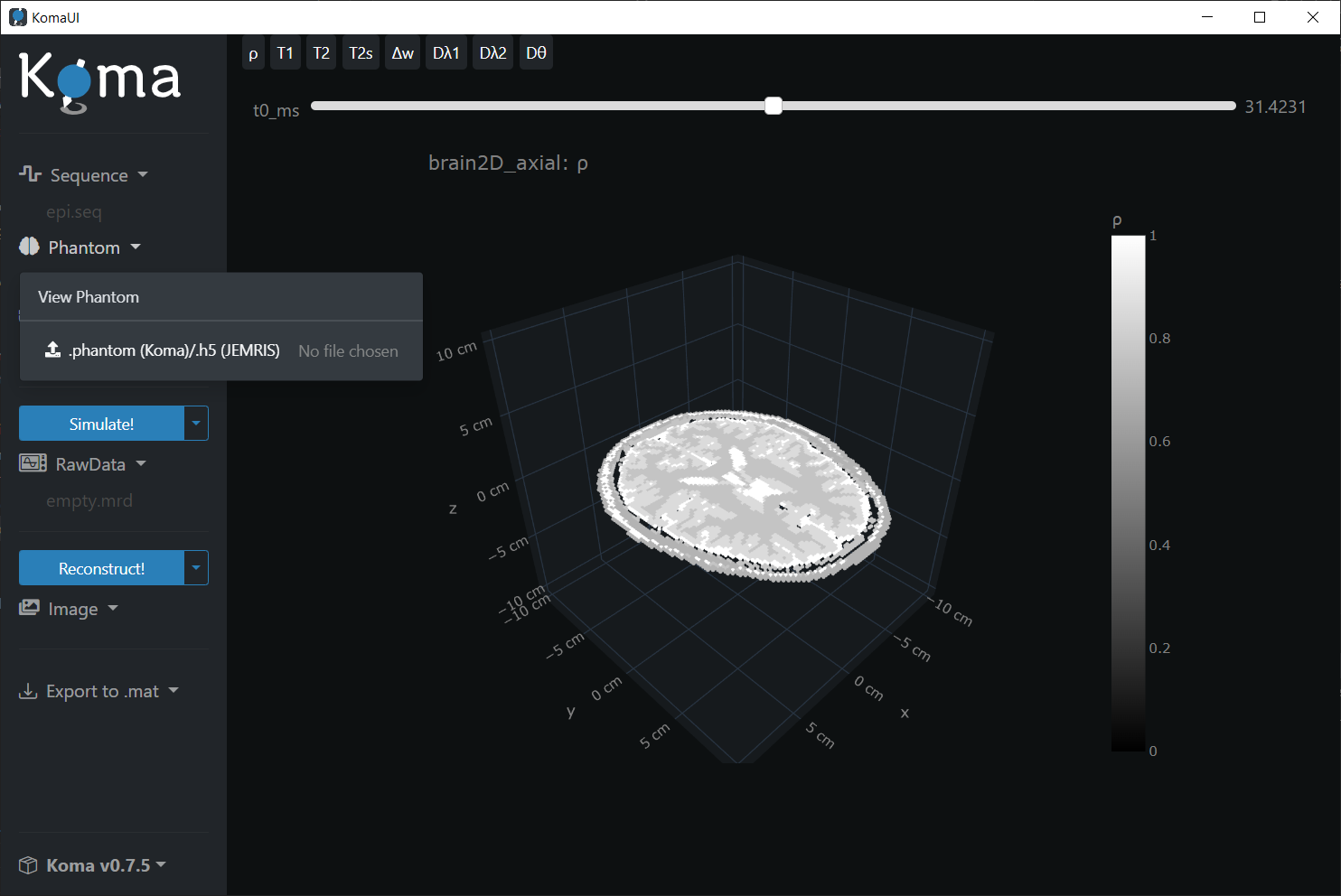 Note that you can select different spin parameters to visualize like ρ, T1, T2, among others.