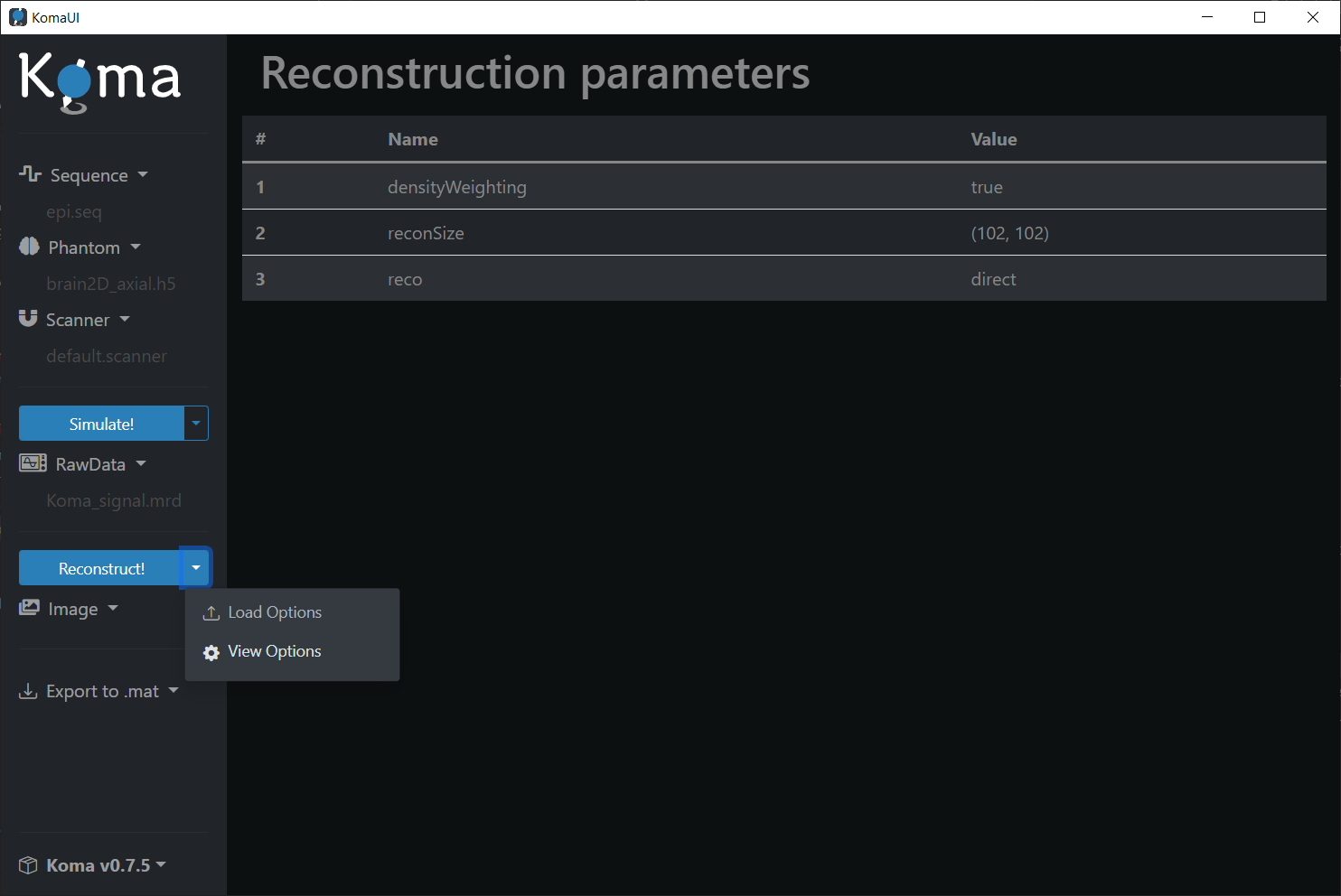 To visualize the default reconstruction parameters, click on the Reconstruct! dropdown and then press the View Options button: