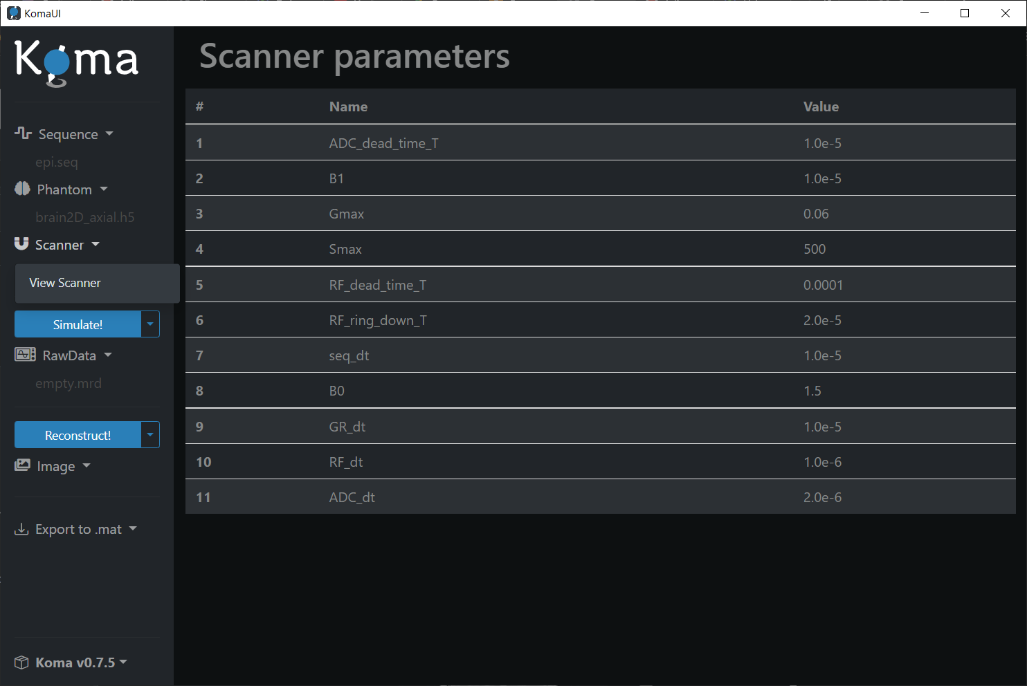You can visualize the preloaded Scanner struct by clicking on the Scanner dropdown and then pressing the View Scanner button. The Scanner struct contains hardware-related information, such as the main magnetic field's magnitude: