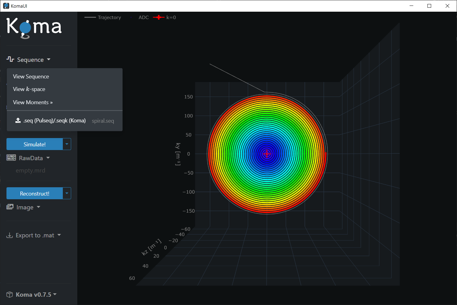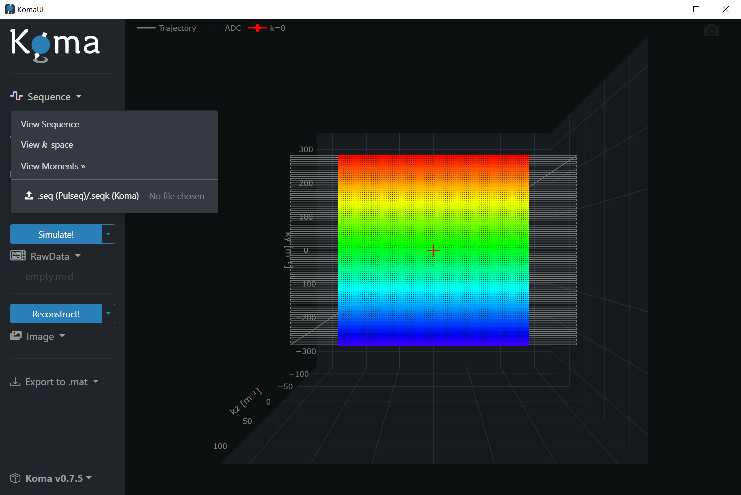 For visualization of the sequence in the k-space, click on the Sequence dropdown and then press the k-space button: