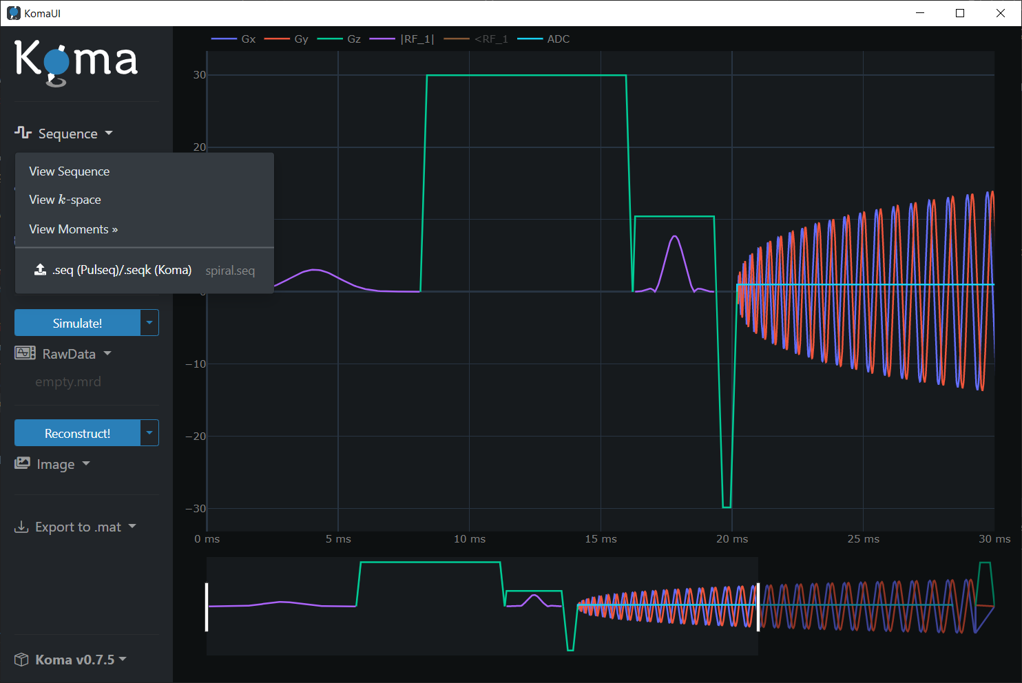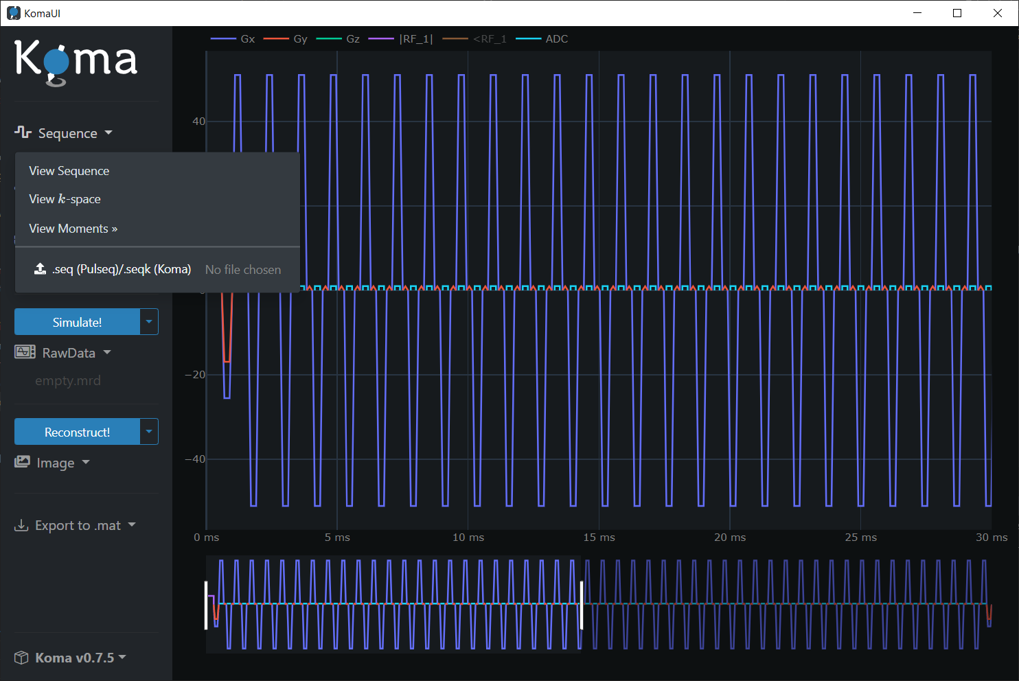 For visualization of the sequence in the time domain, click on the Sequence dropdown and then press the Sequence (MPS) button: