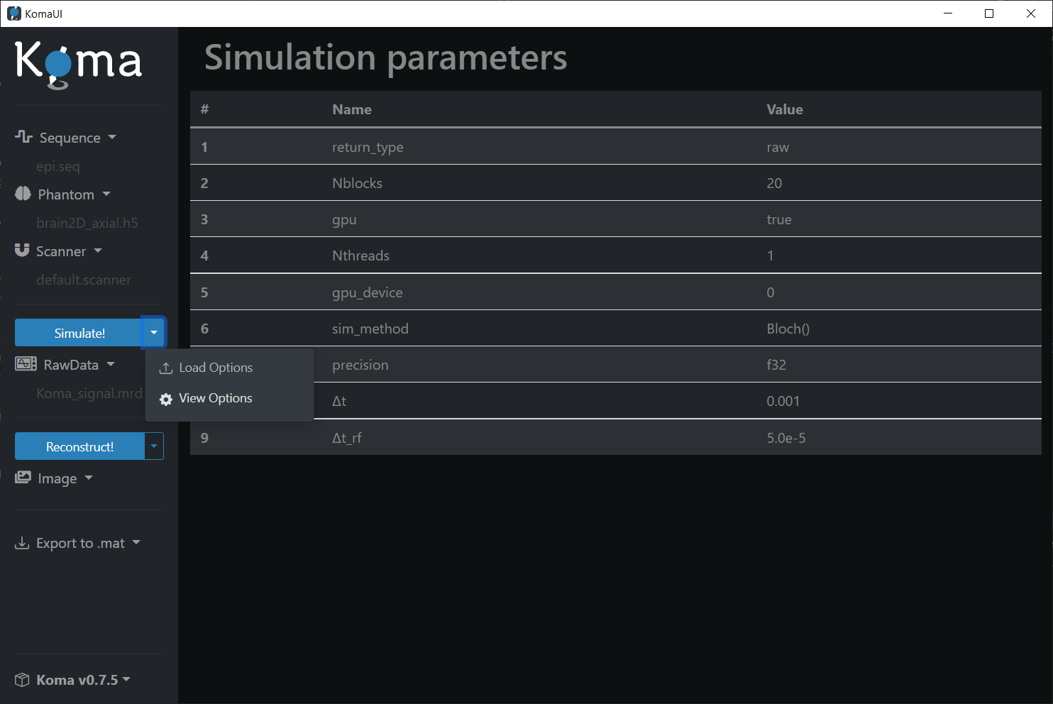 To visualize the default simulation parameters, click on the Simulate! dropdown and then press the View Options button: