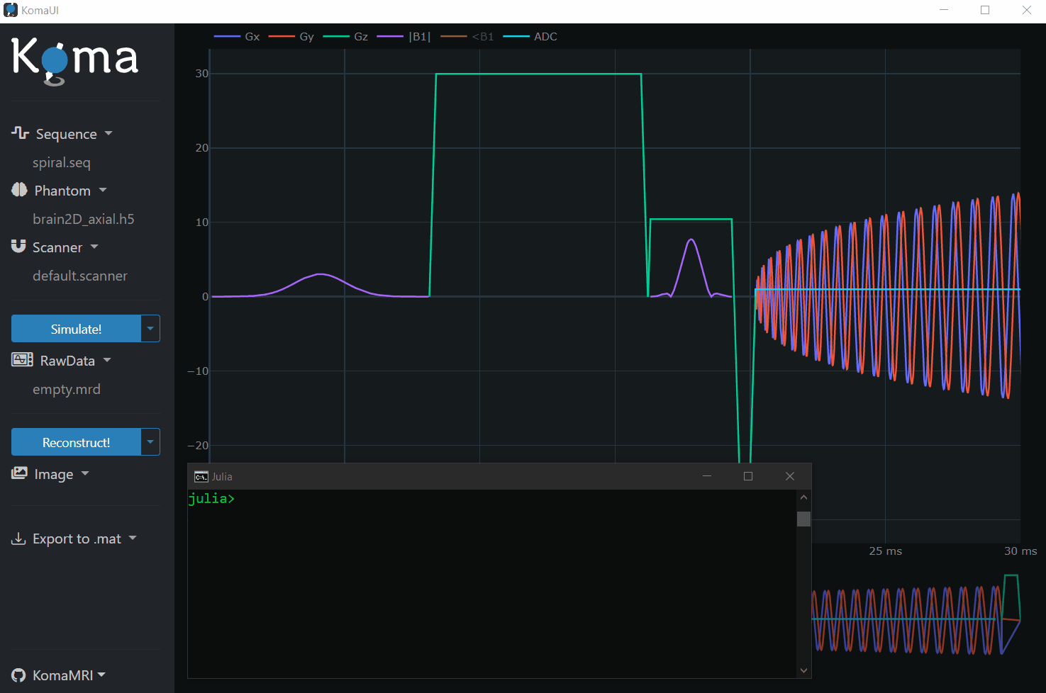 In the following subsections, we will cover all the mentioned steps. First, open the Julia REPL and enter the following commands to include the KomaMRI package and launch the user interface: