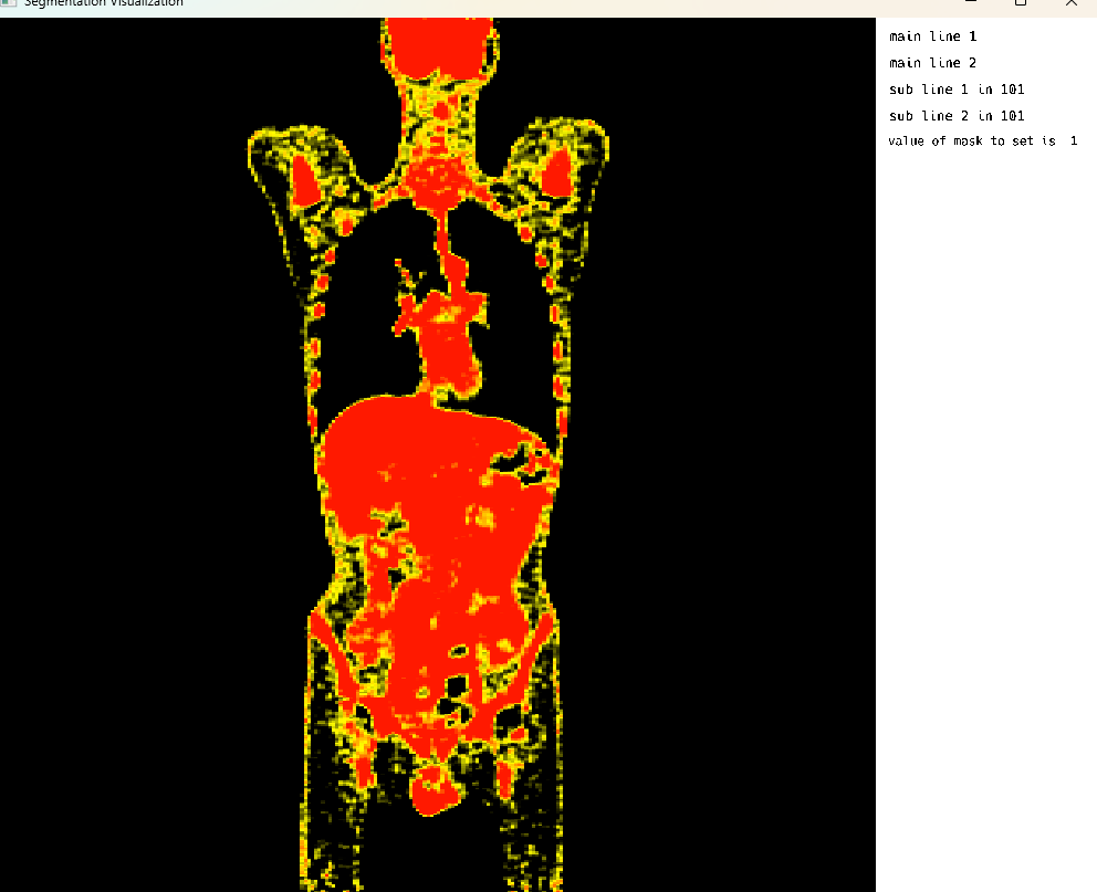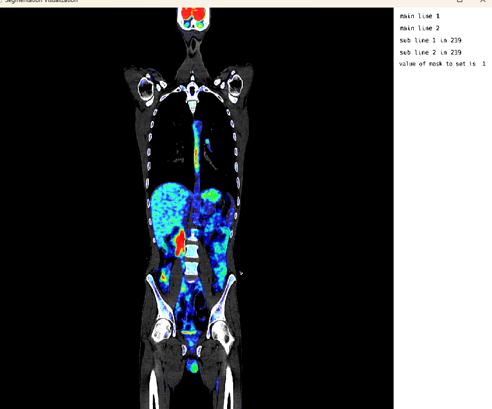 medEyeStruct = MedEye3d.SegmentationDisplay.displayImage(petOverlaidImagesArg)The ITK-style workflow outputs include: - Loading overlaid images using ITK-style workflow - Loading CT: /home/dorachan/Downloads/ct_soft_pat_3_sudy_0.nii.gz - Loading PET: /home/dorachan/Downloads/pet_orig_pat_3_sudy_0.nii.gz - CT size from SITK: (512, 512, 976) - PET size from SITK: (200, 200, 488) - CT spacing from SITK: (0.9765625, 0.9765625, 1.0) - PET spacing from SITK: (4.0728302001953125, 4.0728302001953125, 2.0) - Resampling PET to CT space… - Final CT size: (512, 512, 976) - Final PET size: (512, 512, 976) - Fixed PET texture numb to 3 - Fixed PET range to: Float32[0.13950741, 3457.534]