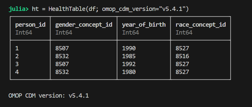 A major part of this project was introducing a new type called HealthTable, which makes it easier to work with OMOP CDM tables in Julia in a reliable and standardized way.