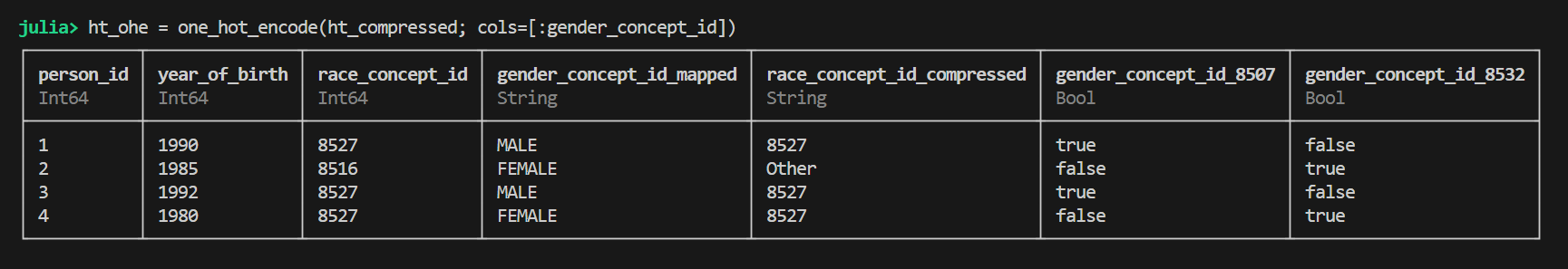 ht_ohe = one_hot_encode(ht_compressed; cols = [:gender_concept_id, :race_concept_id])