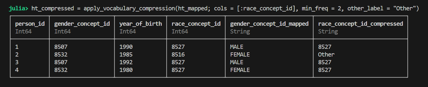 ht_compressed = apply_vocabulary_compression(ht_mapped; cols = [:race_concept_id],