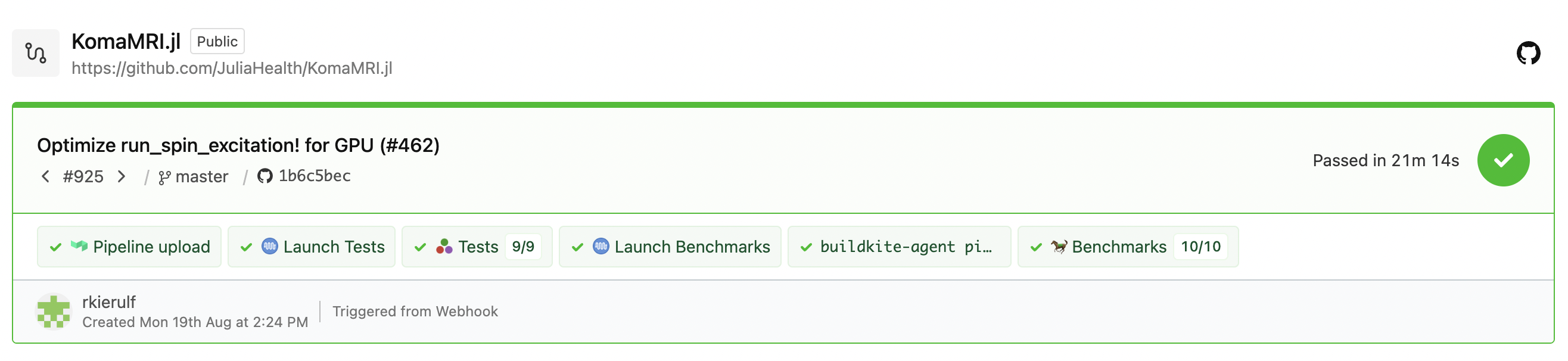 Comments on a pull request with the benchmarking results compared with before the pull request. Example: https://github.com/JuliaHealth/KomaMRI.jl/pull/442#pullrequestreview-2213921334